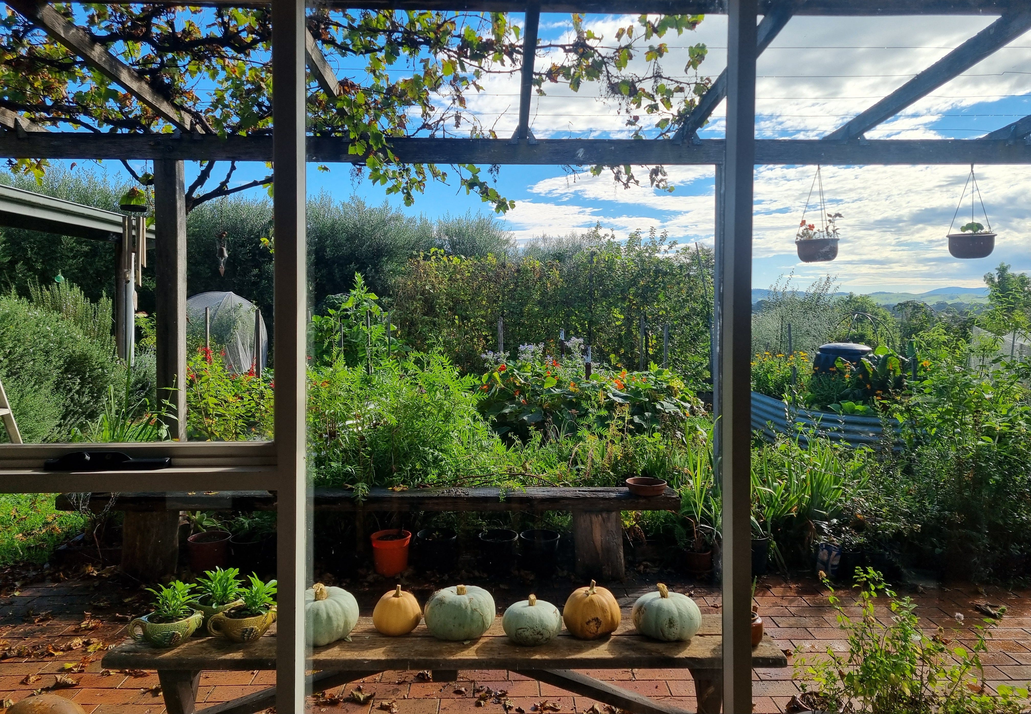 Through the window frame above you can see lots of obvious edible plants - strawberries, sweet potatoes, lettuce, shallots, pumpkins, runner beans, yacon, apple trees, olive trees, persimmon tree, goji berries, silverbeet/Swiss chard, raspberries, tomatillos.