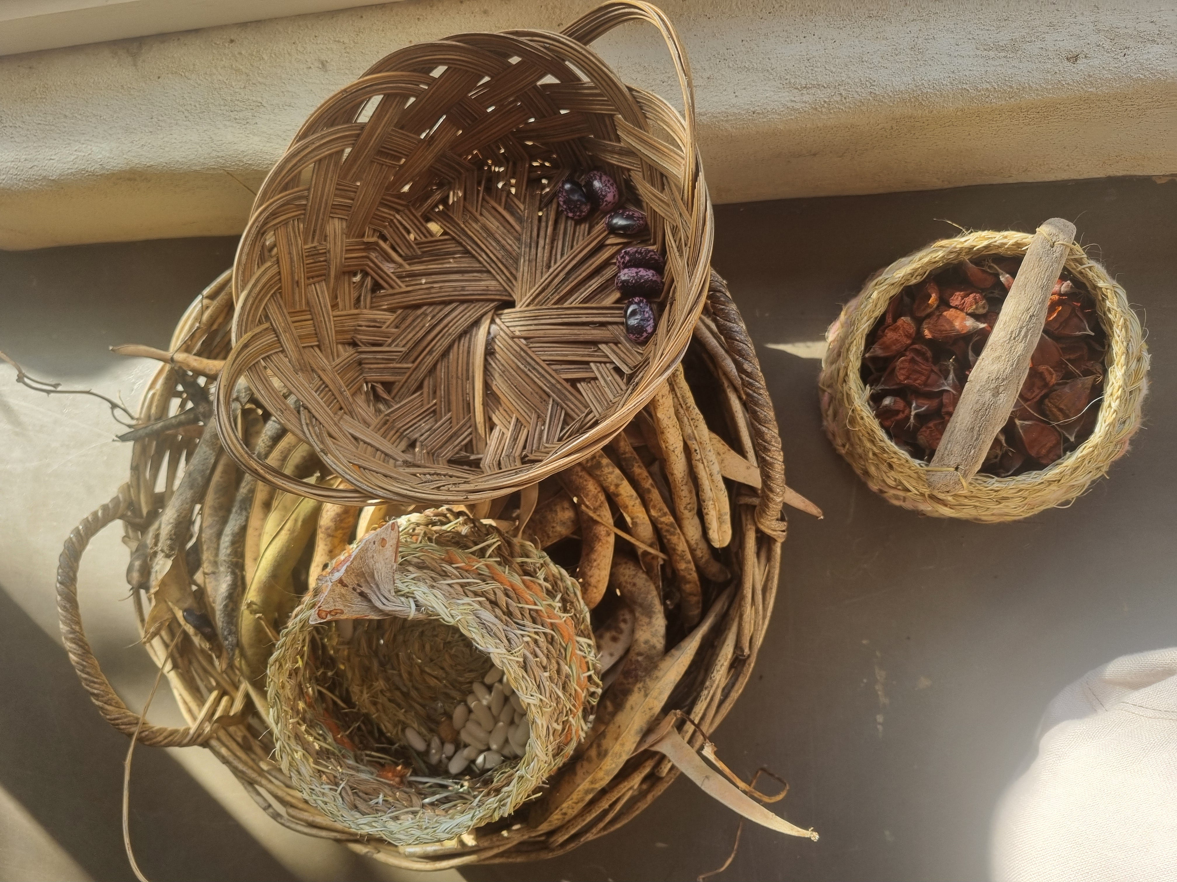 Scarlet Runner Beans and White Beans ready for my grandson to shell - a very good pastime for a busy two-year-old, and foraged chestnuts for the dyebath. The two smaller baskets are hand-made from New Zealand Flax leaves and other local materials.